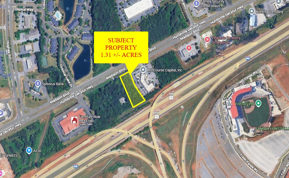 Prime commercial lot for sale with frontage of 124' on Madison Blvd. Minutes to HSV International Airport and Downtown HSV. South side of the lot faces I-565 for maximum exposure with over 110,000 vehicles per day. Retail, office and/or possible billboard revenue for this site generating added owner/operator income per month.